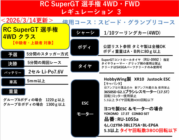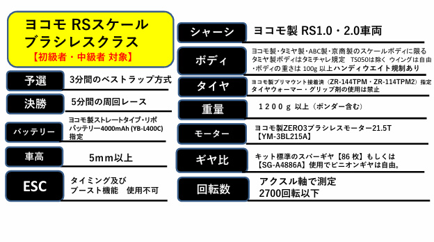 車重、車高、各クラスESC規定、モーター、バッテリー電圧、回転数等