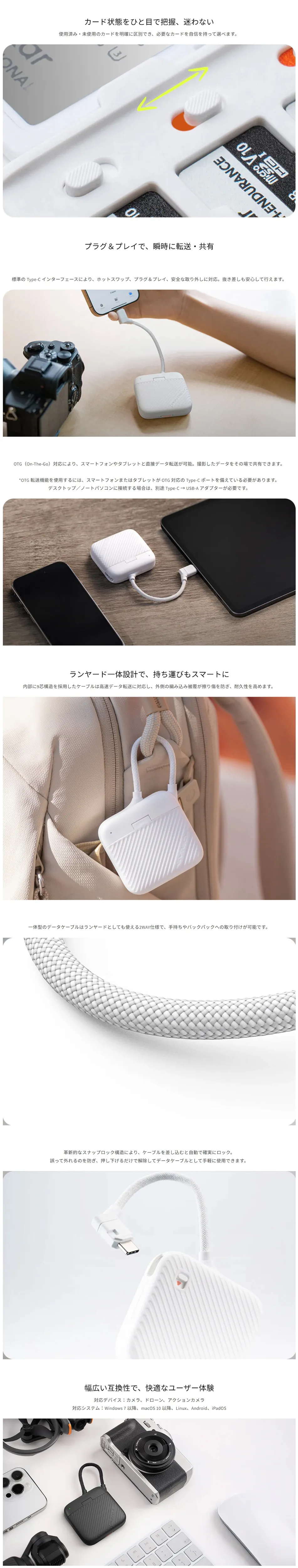 USB 3.1 高速チップを内蔵し、最大312MB/sの高速転送に対応。SD/micro SDのデュアルカード同時読み取りが可能で、Type-Cケーブルによるプラグ&プレイ接続にも対応します。付属ケーブルはランヤードとしても使用でき、携帯性にも優れています。