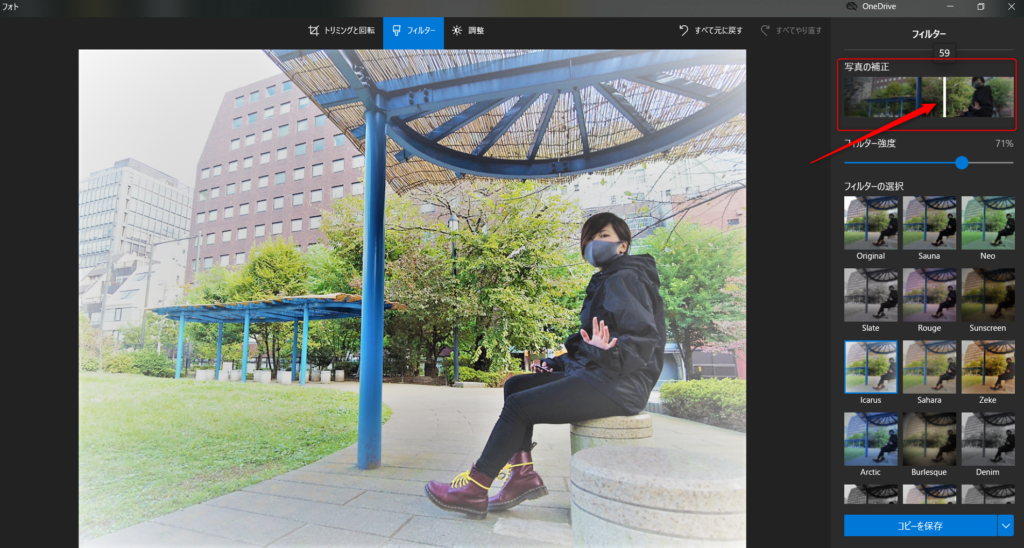 まずは「フィルター」タブの「写真の補正」のところにあるスライダーを右にいじるだけでも雰囲気変えられますので、お試しくださいませ。