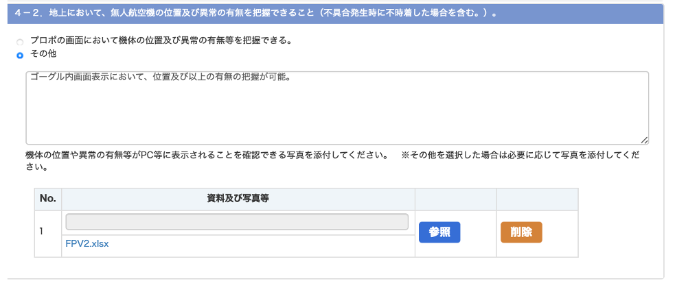 その他をチェックし、ゴーグル内画面表示において位置及び異常の有無の把握が可能と記入し、[4-1.]同様に確認できるファイルをアップしてください。