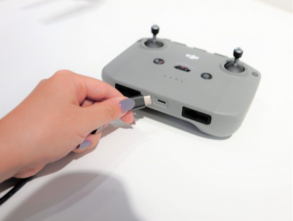 DJI Mini 2、Mavic Air 2、DJI Air 2S と同じ DJI RC-N1送信機で、充電には USB Type-Cケーブルを使用します。ポータブル充電器にはUSB-A出力があるので、お持ちのケーブルを使って送信機手前側の USB-C端子に接続して充電します。
