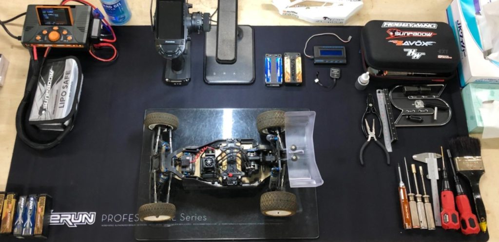 マシンのメンテナンスやタイヤの準備、消耗品の補充等は勿論のこと、最低限必要なアイテムといった所では、マシン、送信機、工具、充電器、バッテリー、ピットマット、延長コードが私の中ではマストアイテムです。忘れ物をしてしまうと折角の1日を棒に振ってしまうので確認を怠らない様にしましょう!