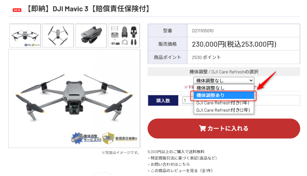 なお、オンラインストアから調整済みの機体を購入したいときは、商品ページをを確認の上「調整済み」を選択してカートに追加してください。