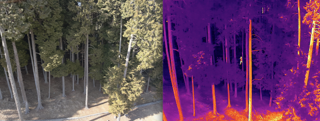 日中の業務のみであれば M30、赤外線カメラを必要とする調査業務や夜間も使用する場合は M30T という選択になります。赤外線カメラを搭載している M30T であれば、こちらの画像のように通常の可視光カメラでは気付くことのできない人や動物等を簡単に発見することができ、捜索業務などでは非常に有用です。