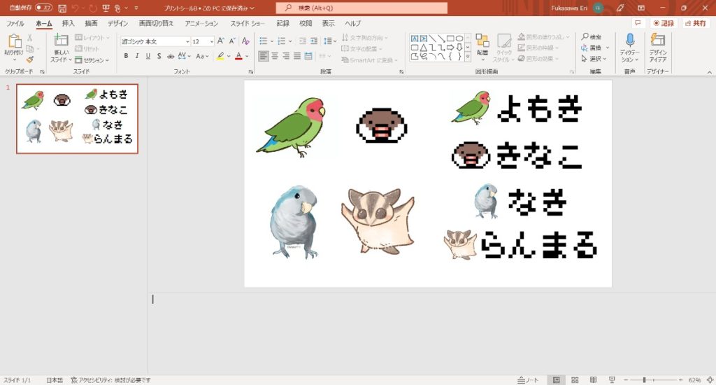 同じ方法で、池田家のペットたちの「おなまえシール」を作ってみました。まずは先述のPower Pointで入稿データを作成していきます。こちらは「美咲ゴシック」というフォントです。