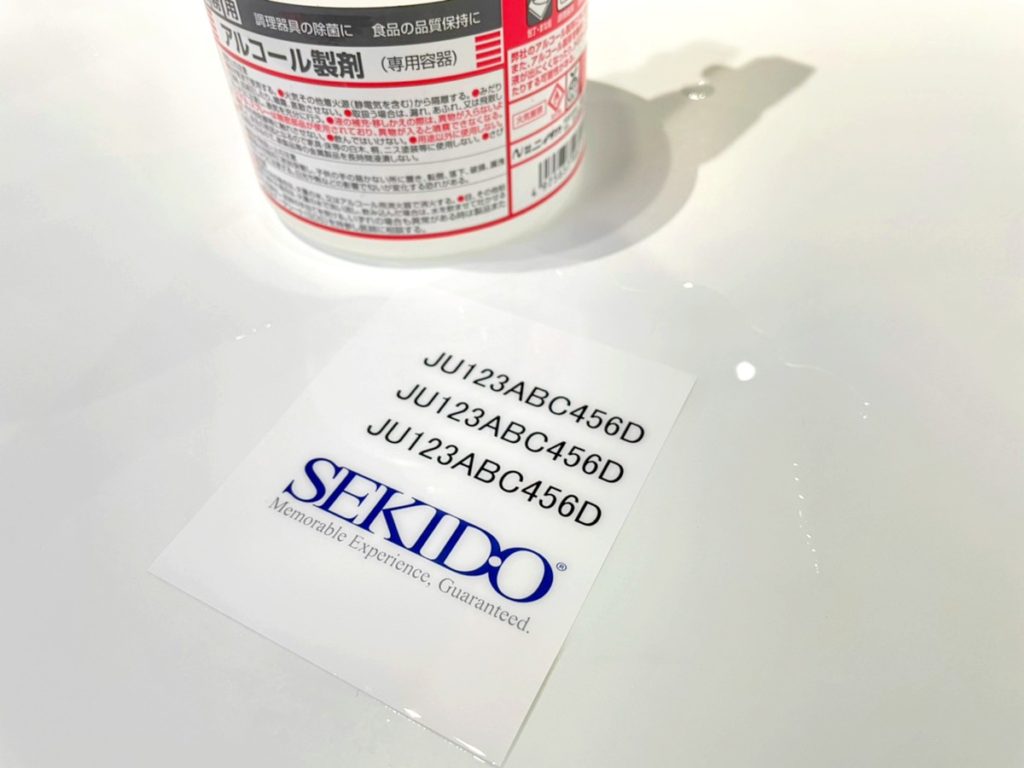 貼り付け用のステッカーには「雨風への耐久性」が求められるとのことでしたので、「本当に大丈夫?」という疑問について、水と無水アルコールでインクが溶け出すか検証してみます。