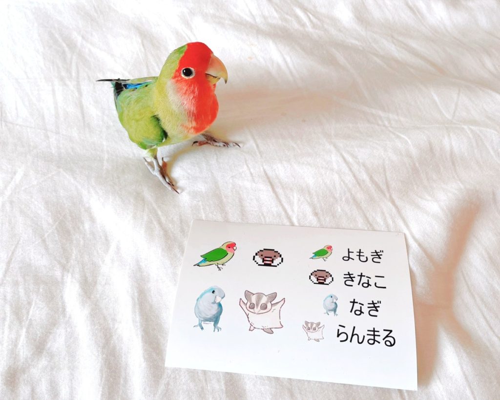 印刷しました。さっそくコザクラインコの「よもぎ」に出来栄えを見てもらいました。