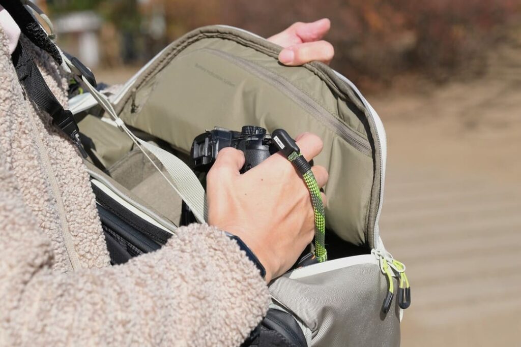 サイドアクセス構造により、バッグを下ろすことなくカメラを素早く取り出すことができ、撮影チャンスを逃しません。