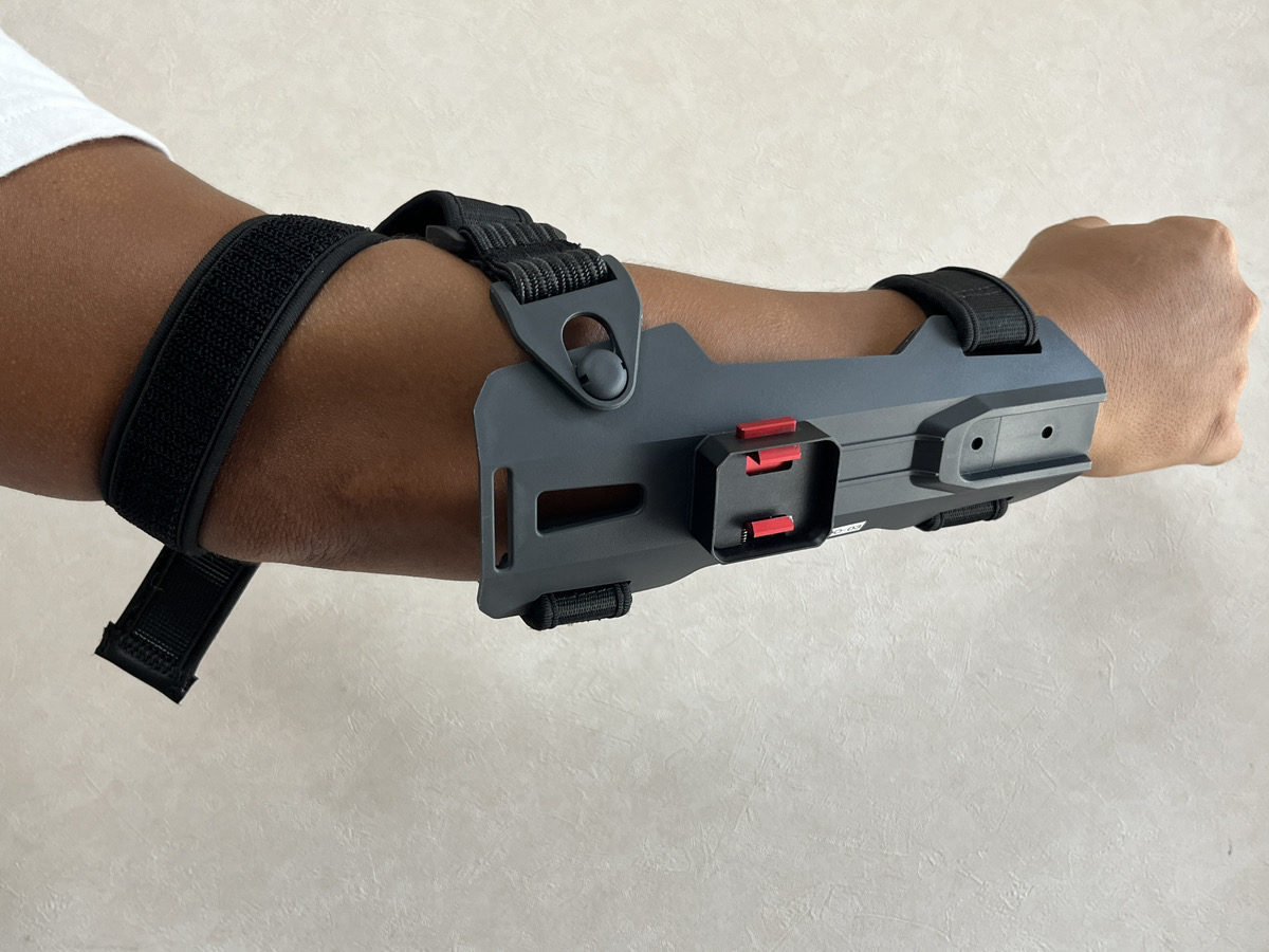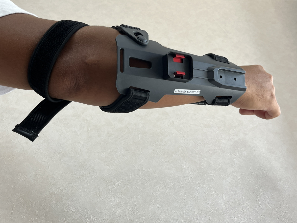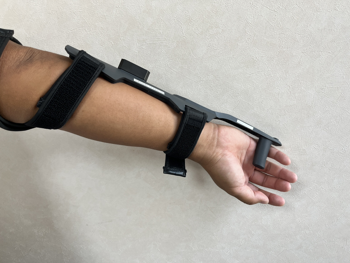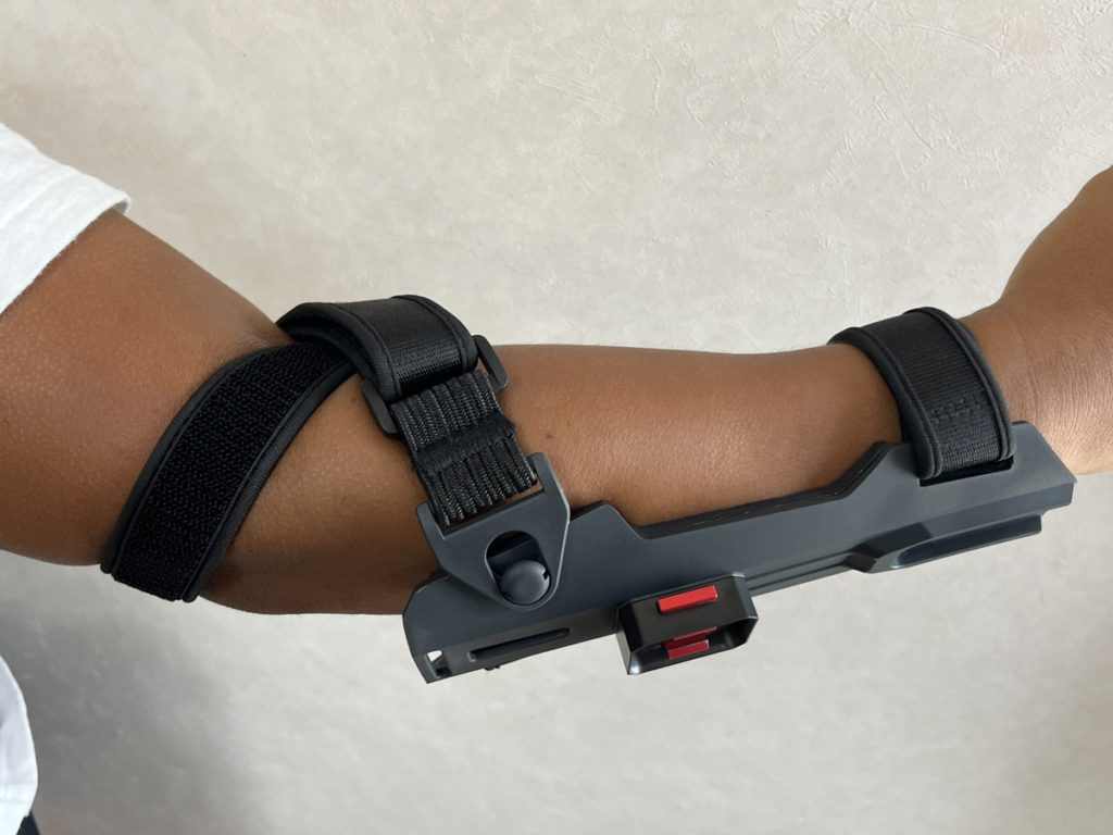 3.腕関節側のバンドは、動画のように上腕を軽く一周してからバックルを止め、腕がやや曲がる状態でバンドの長さを固定します。