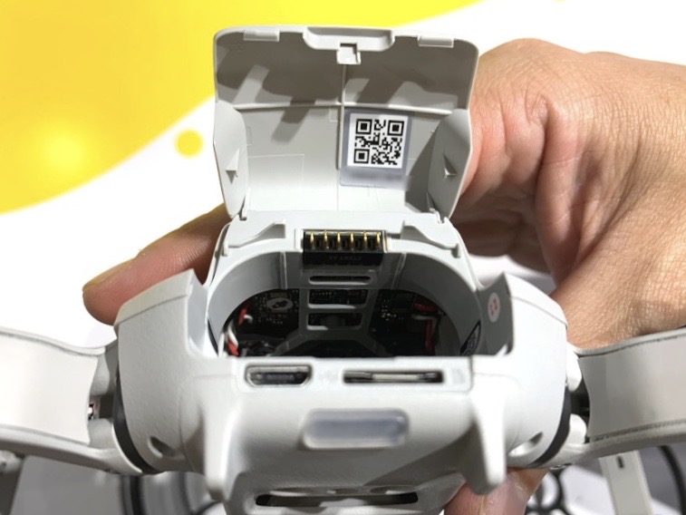 Mavic Mini には障害物センサーが搭載されていますので、機体表面はツルツル。機体後部には、microSDカードスロットと充電用の端子が備えられています。