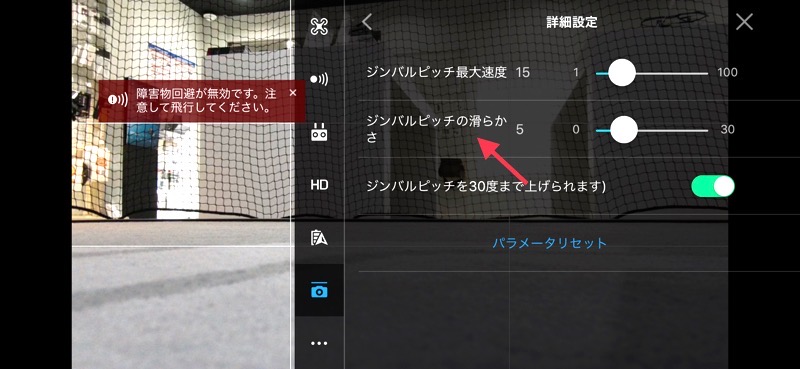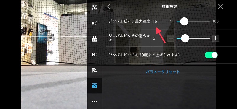 Mavic 2 シリーズの場合は「0~30まで」の数値を選択可能で、小さな数字ほどダイヤルを止めた瞬間にジンバルがピタっと静止します。
