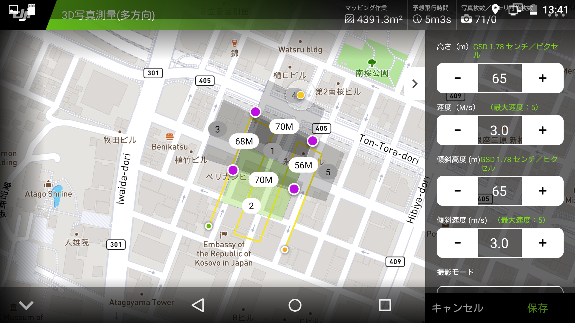今回の撮影対象は周辺に建造物などが無かったため、先に紹介した撮影方向別の撮影設定は行わず統一の設定で撮影しました。
