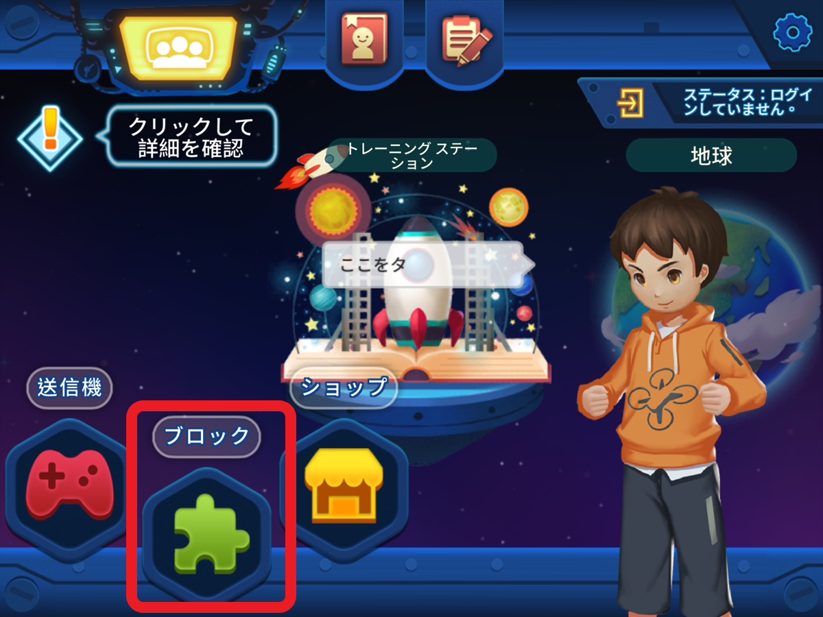 Tello Edu アプリを起動して、メイン画面で[ブロック]をタップ