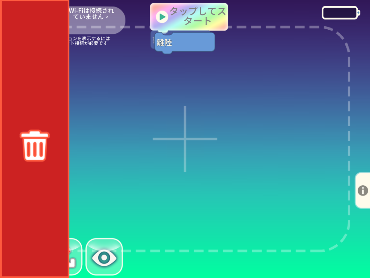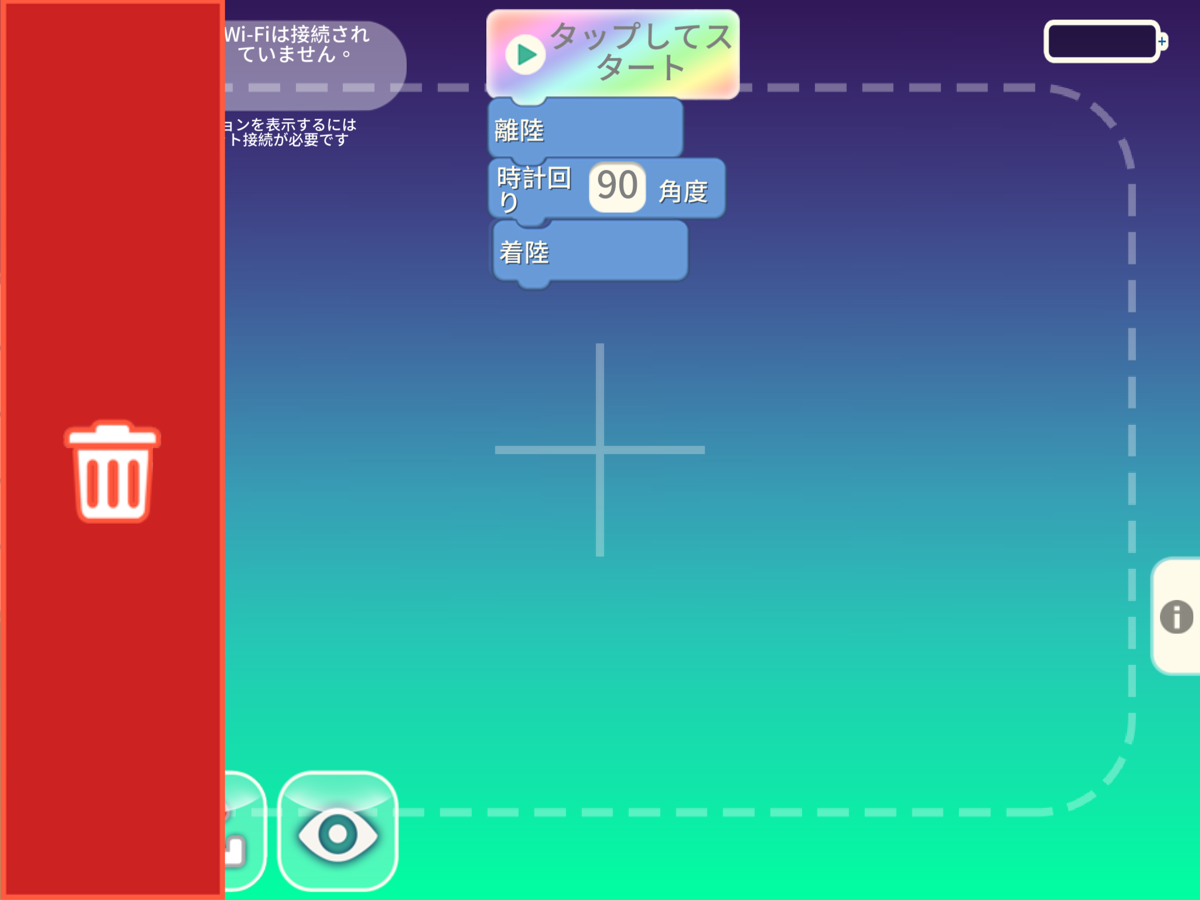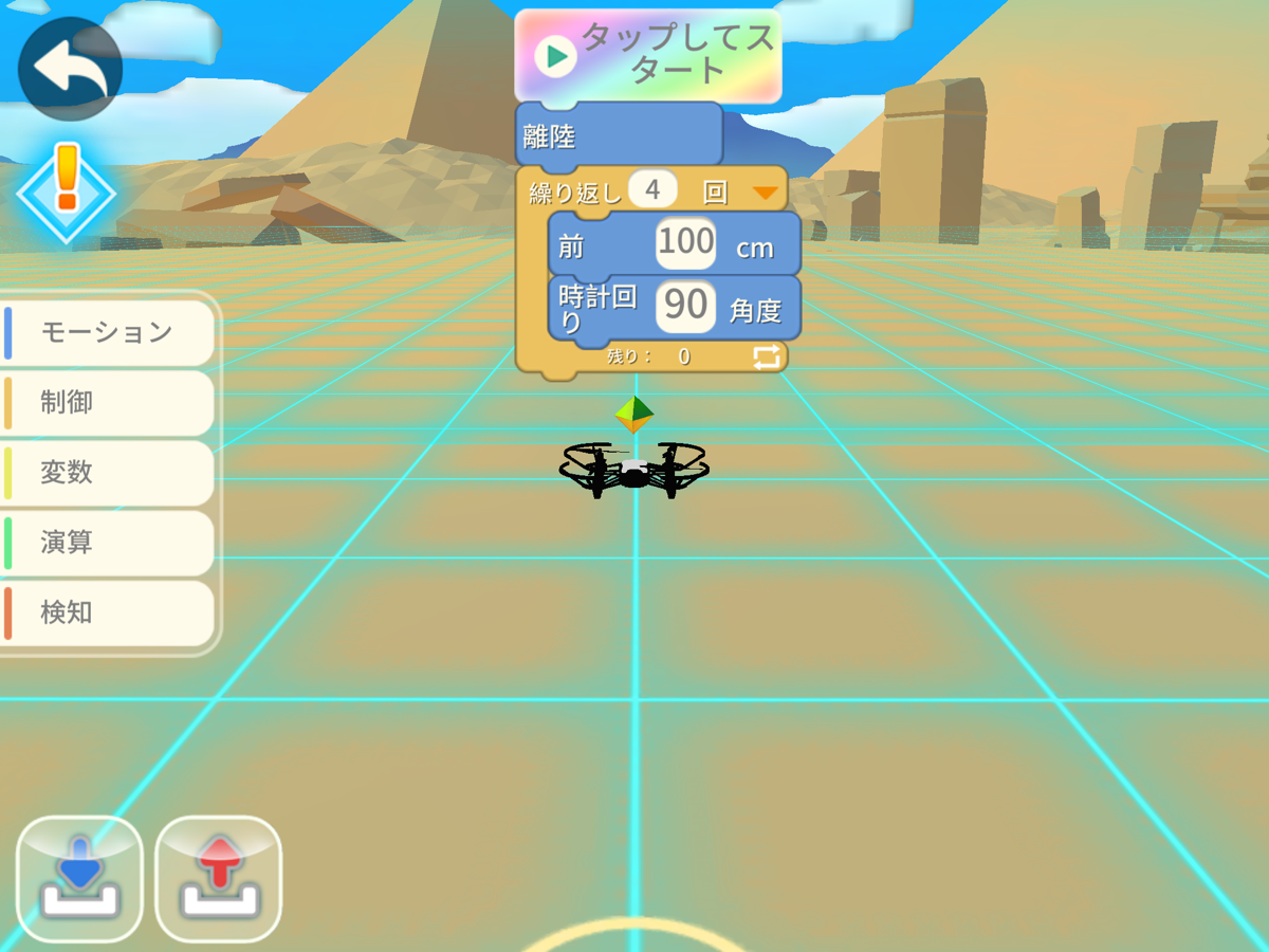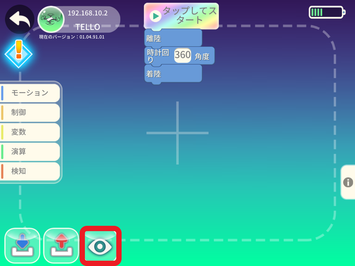 実際の Tello でプログラムを試す前に、アプリ内で「目玉のアイコン」を押すことでシミュレーションを見ることができます。目玉のアイコンを押した後、[タップしてスタート]のボタンを押してみましょう。