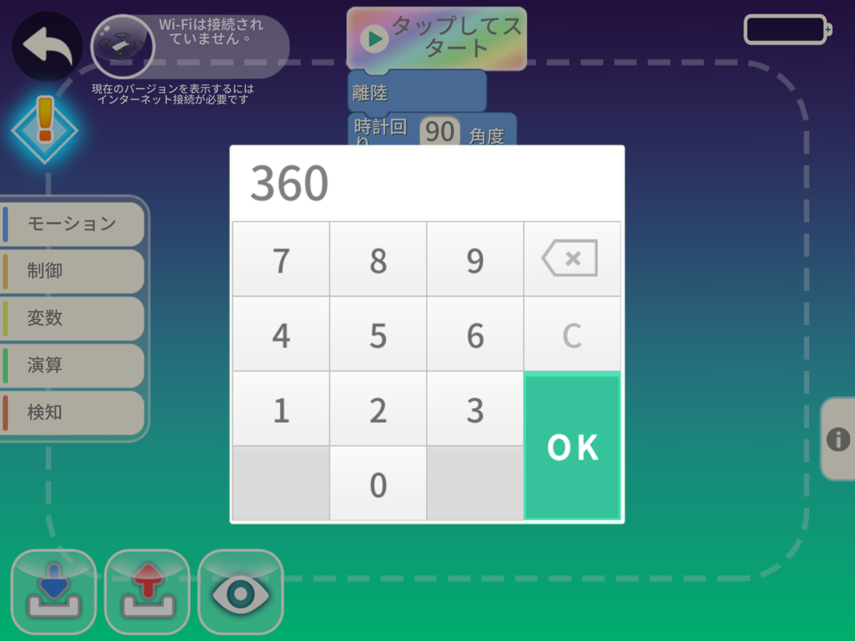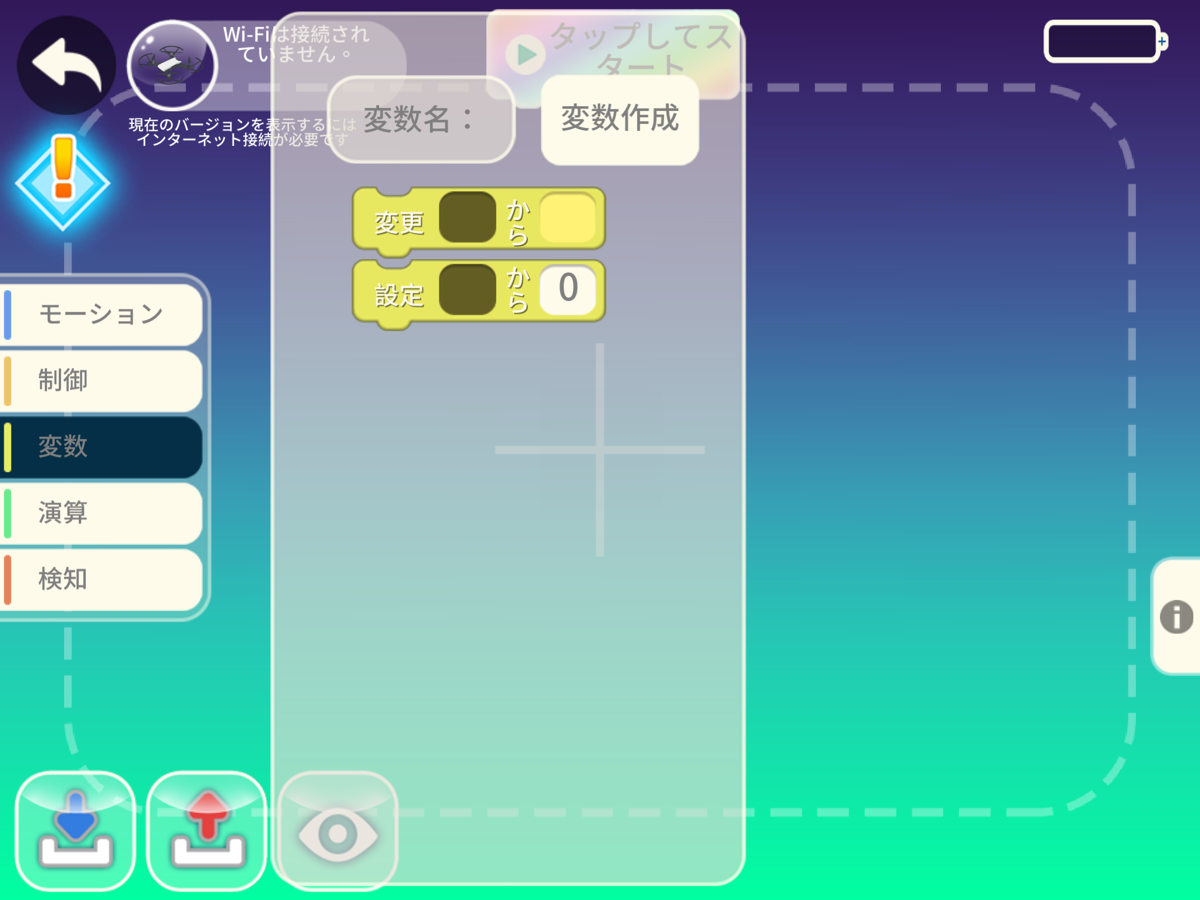 ブロックの画面で、ドローンのアイコンが緑になっていれば接続成功です。周囲に注意しながら[タップしてスタート]ボタンを押してください。