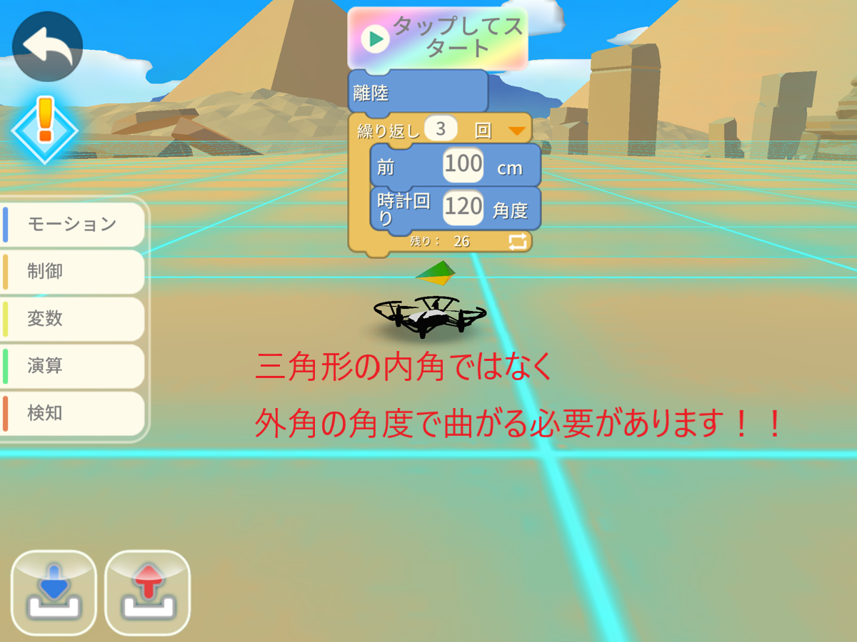 以下のブロックを使ってドローンが三角形に飛行するプログラムを作ってください。