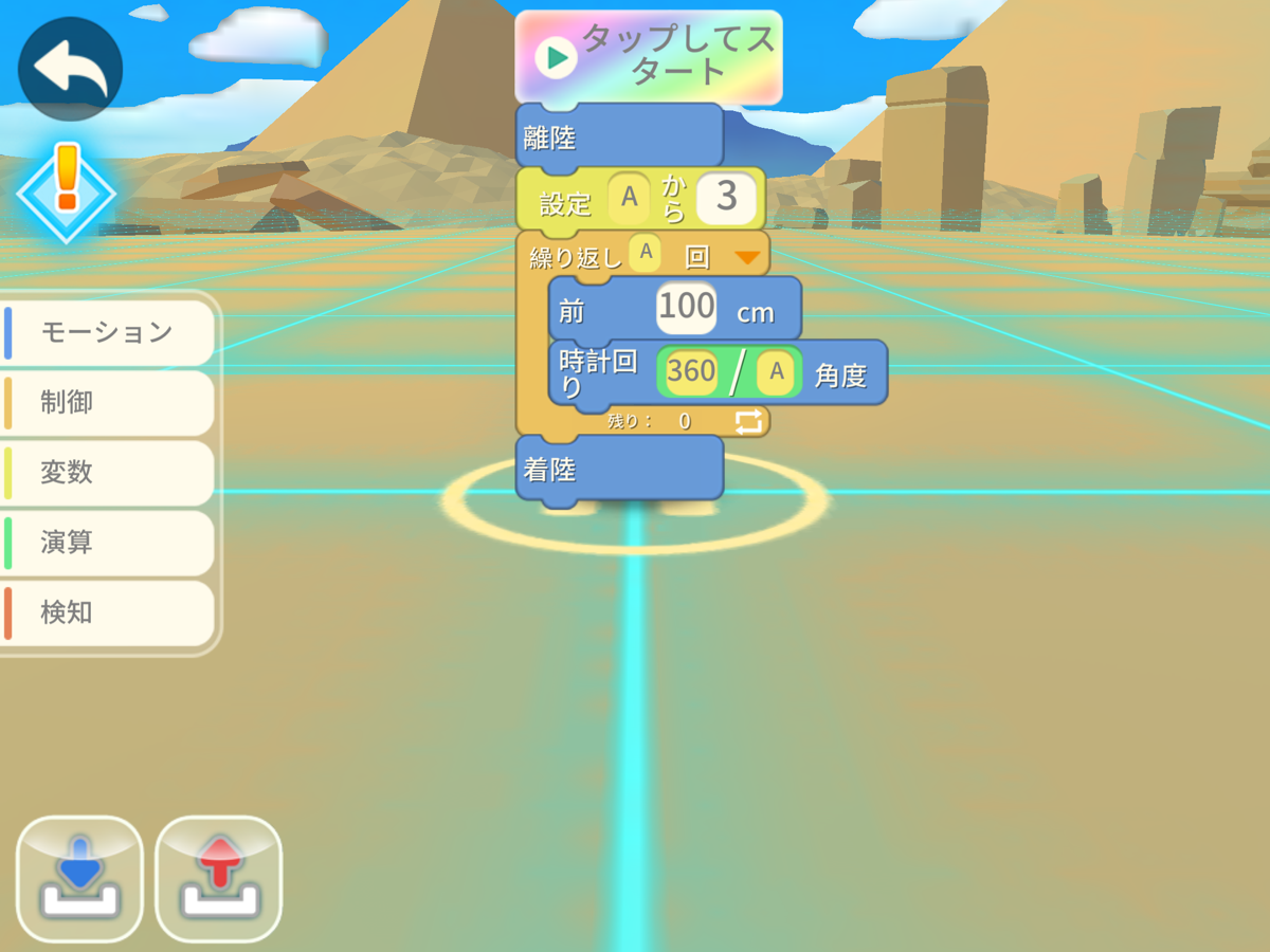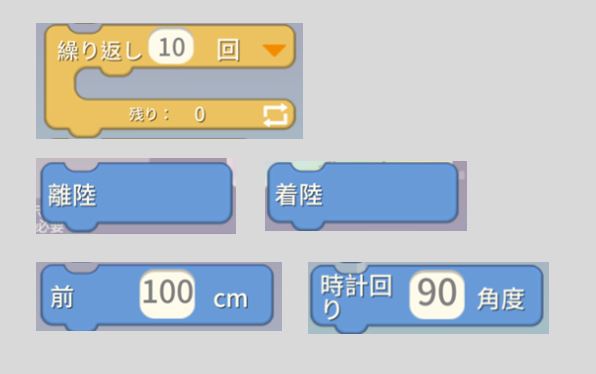 [制御>繰り返し]、[モーション>離陸]、[モーション>着陸]、[モーション>前]、[モーション>時計回り]