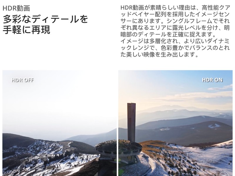 スマートフォトというのは、シーン認識/ハイパーライト/HDRが1つのモードに統合された機能で、これにより 夕焼け/空/草地/雪/森林 などの様々なロケーションを Mavic Air 2 だけで手軽に撮影可能です!