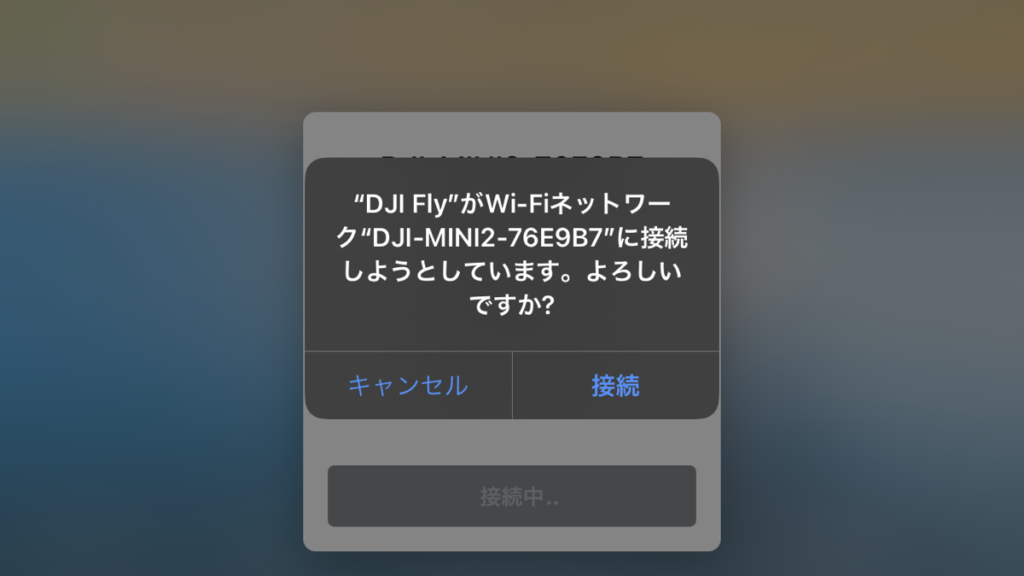 この状態で、DJI Fly アプリを起動するとコチラの画面になりますので、「接続」をタップしてください。