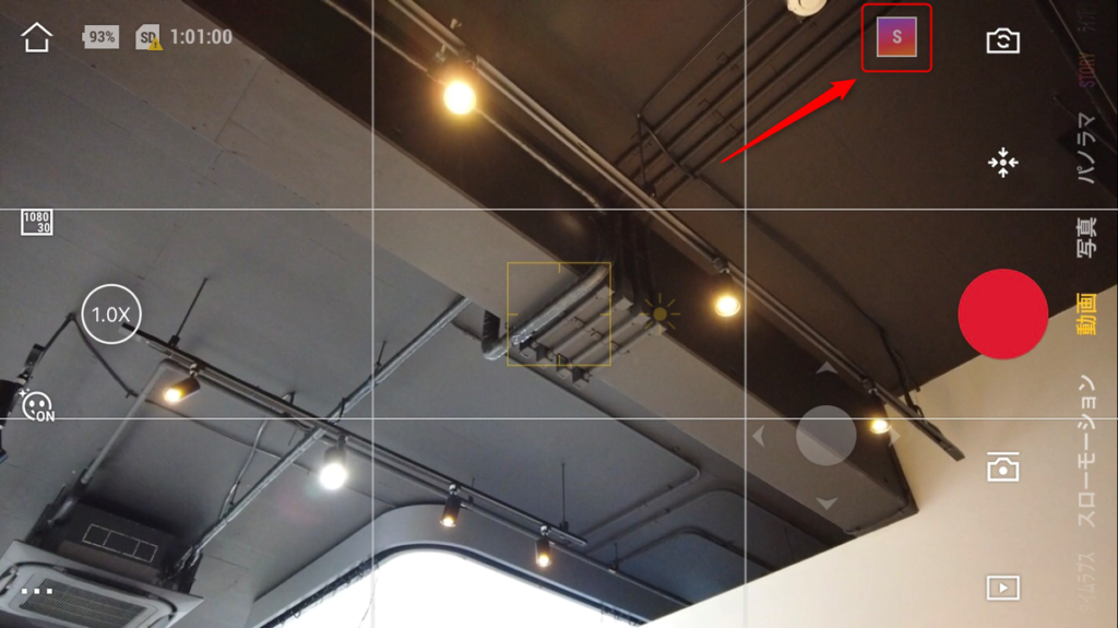 カメラ映像が確認できる画面に移行しますので、右上にある「S」をタップしてください。