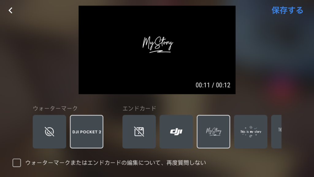 エンドカードは、動画のラストに表示されるカット映像です。DJIロゴや「This is my story」など、数種類からお好みのものをお選びください。