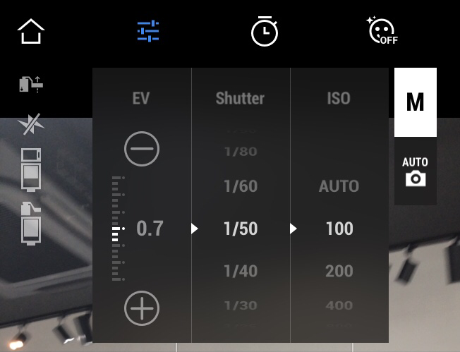 EV値、シャッター、ISO感度の設定ができます。ここの設定数値はスマートフォンのカメラ性能に依存します。