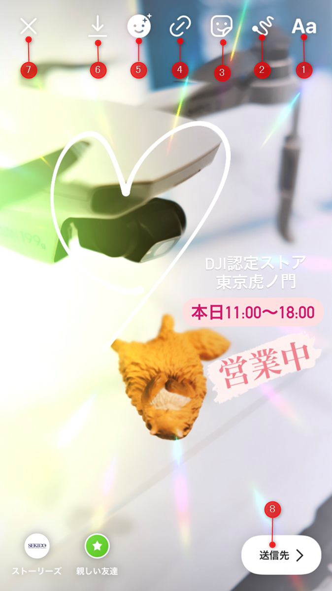 加工が終わったら、⑧をタップして投稿先を選んで送信すれば投稿完了です。