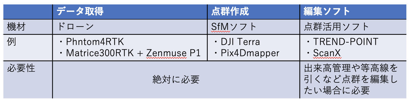 表からわかるように、ドローン測量を実施するためには「機体」と「SfMソフト」が絶対に必要になります。生成したモデルから面積や体積計算ができれば良いという際は SfMソフトまでで十分となりますが、点群の編集を実施したい場合は追加で編集用のソフトが必要となりますので、必要に応じて購入をご検討ください。