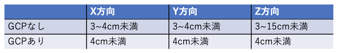 通常のドローンの場合は GPS精度となるため、位置情報にメートル単位で誤差が発生する可能性がありますが、上記2機種に搭載された RTK機能を使用すると誤差はセンチ単位まで向上します。現場の環境によりブレはありますが、概ね下記のような精度となります。