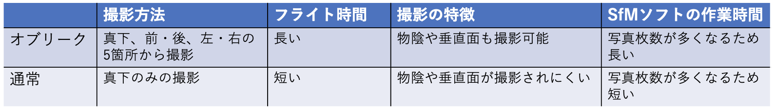 通常の飛行では真下方向のみの撮影のため、影になっている部分やビルのような垂直に立っている構造物の場合、しっかりとデータを取得できず点群作成時に穴が開いてしまうことが多々あります。しかし、オブリーク機能を使用することで不足のないデータを取得することが可能となります。