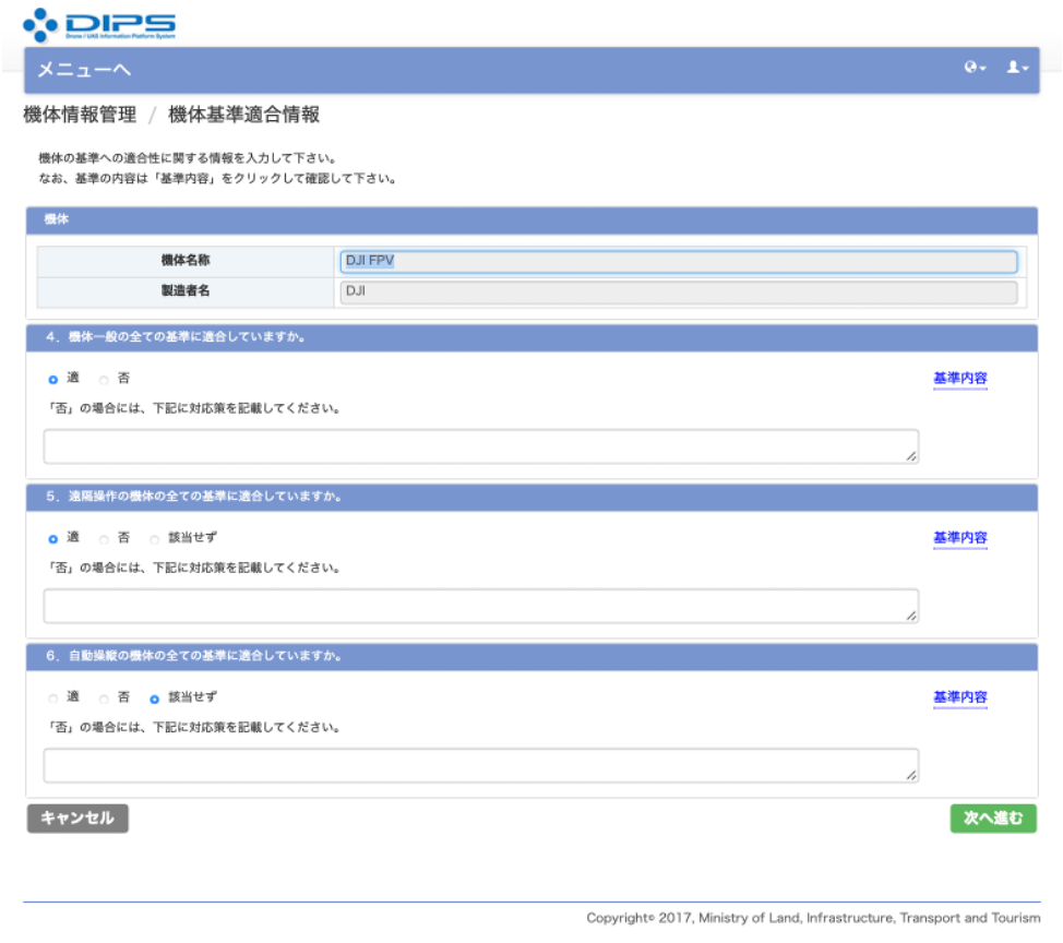 続けて「機体の運用限界」「飛行方法」を入力します。