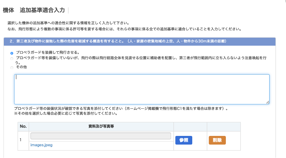 人・家屋の密集地域の上空、人・物件から30m未満の距離を飛行させる場合は、以下から対策を選択し必要に応じて画像の添付を行ってください。