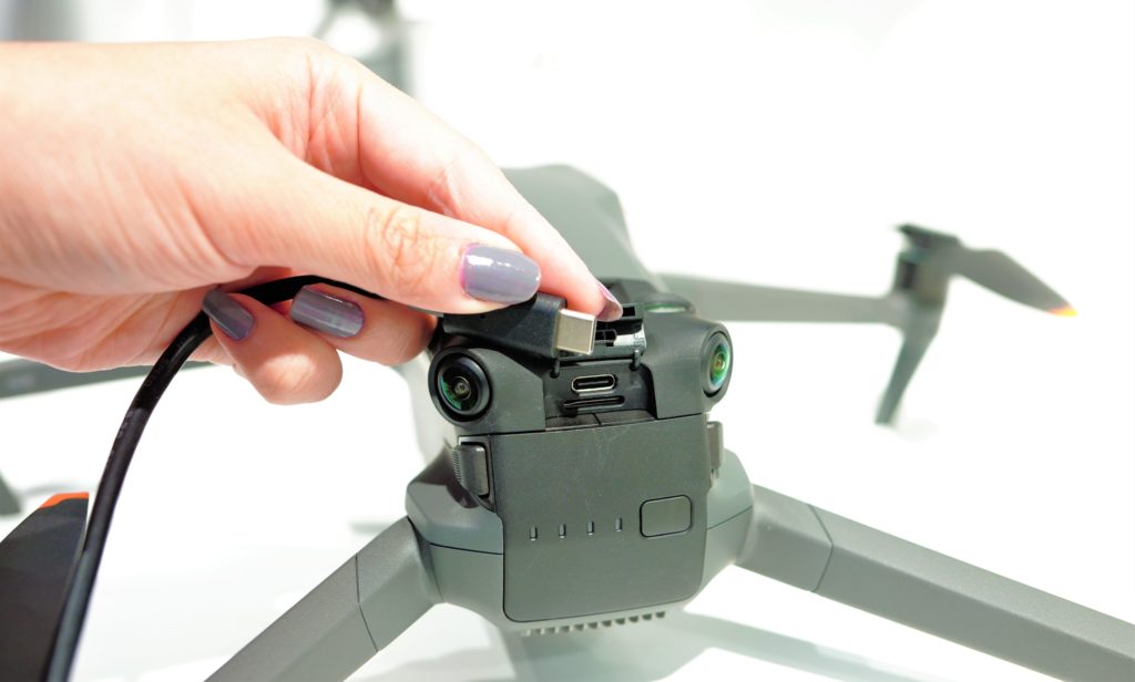 充電方法はこれまでの Mavicシリーズに変わって、本体にバッテリーを装着した状態で付属のポータブル充電器を使用します。Mavic 3 本体のバッテリーのすぐ上に USB-C端子がありますので、カバーを開けて接続してください。
