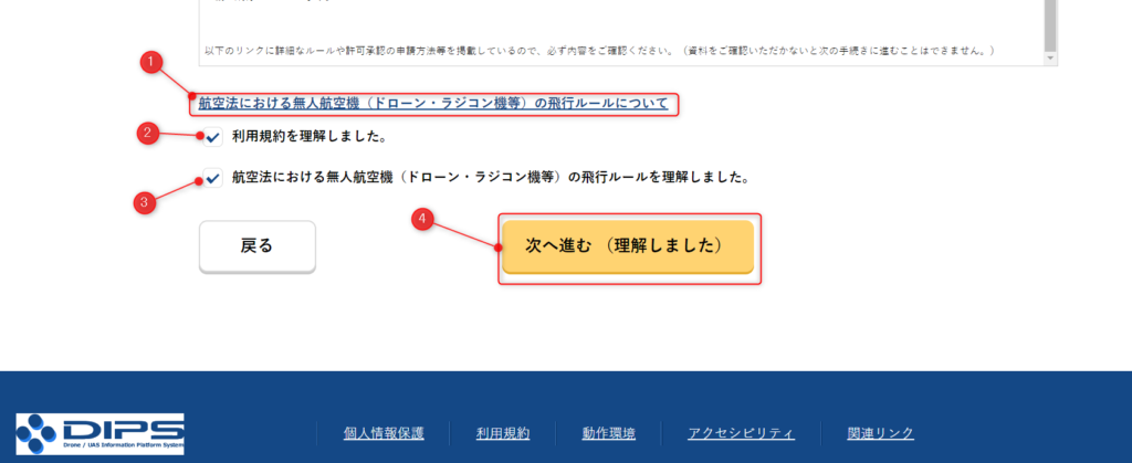 「利用規約」と「無人航空機の飛行ルール」が表示されます。テキストボックス2つは最後までしっかり目を通し、[航空法における無人航空機(ドローン・ラジコン機等)の飛行ルールについて]のリンクをクリックして内容を確認してから、2つのチェックボックスにレ点を入れ、[次へ進む(理解しました)]を押してください。