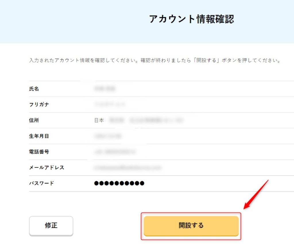 各項目の入力が済んだら、[確認]を押してアカウント情報を確認しましょう。間違いがなければ[開設する]をクリック。