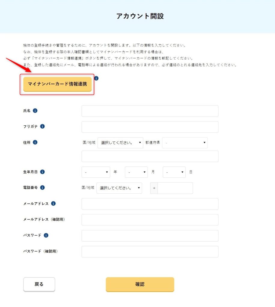 氏名/フリガナについては、氏と名の間に全角もしくは半角スペースを入れる必要があります。本人確認をマイナンバーカードを使って行う方は黄色の[マイナンバーカード情報連携]を押してください。詳しい説明が表示されます。