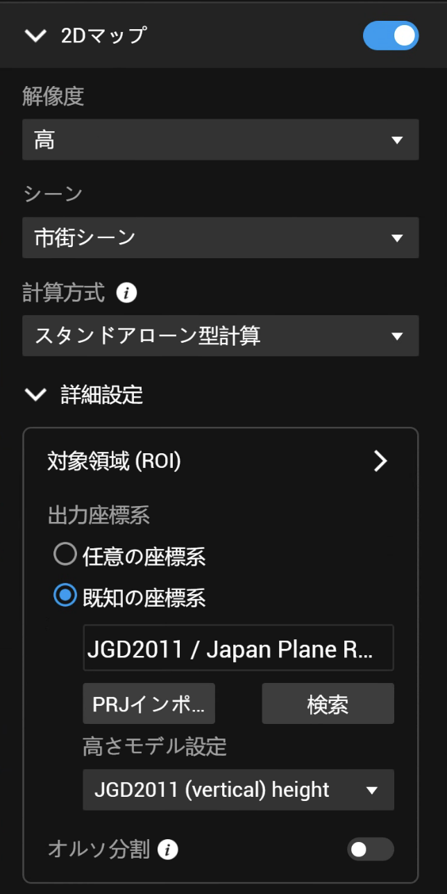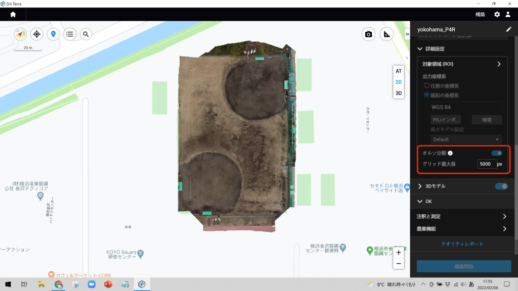 2Dマップ再構築モードに「オルソ分割」機能が新規追加されました。2Dモデル構築時に辺の長さを設定することにより、オルソ画像の分割出力に対応しました。最小で 1000pxから指定することができます。