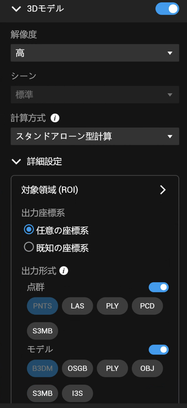 可視光での構築ミッション画面で、「空中三角測量」「2Dモデル」「3Dモデル」3つのカテゴリに分けて設定が行える様になりました。