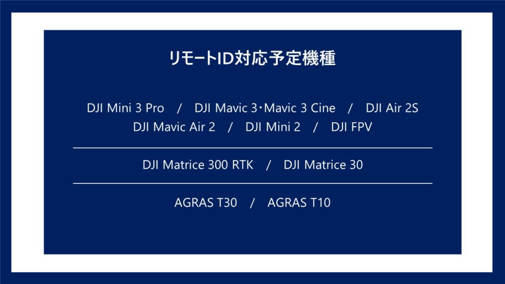 リストに記載があります通り、リモートID対応の機種は DJI Mini 3 Pro / DJI Mavic 3シリーズ / DJI Air 2S / DJI Mavic Air 2 / DJI Mini 2 / DJI FPV / DJI Matrice 300 RTK / DJI Matrice 30 / AGRAS T30 / AGRAS T10 の10機種です。(2022年9月12日現在、10機種全て対応済みです)