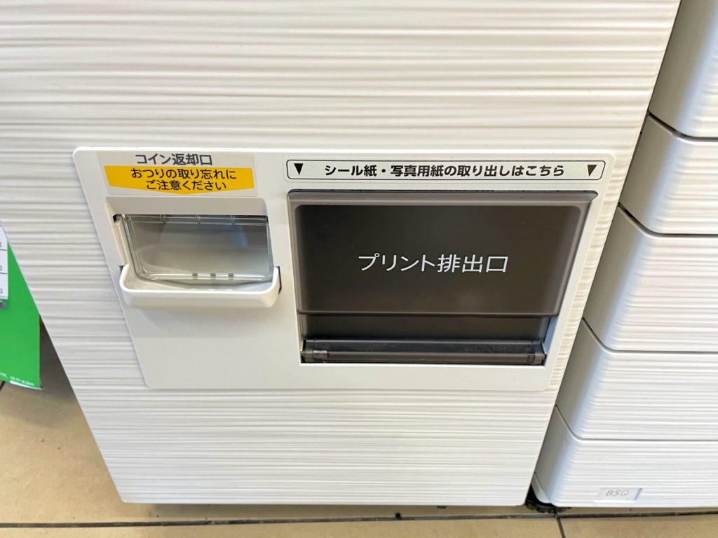 印刷が終わると、コピー機の低い位置にある「プリント排出口」からシールが出てきます。カバーを上から引いて取り出してください。プリクラみたいですね。