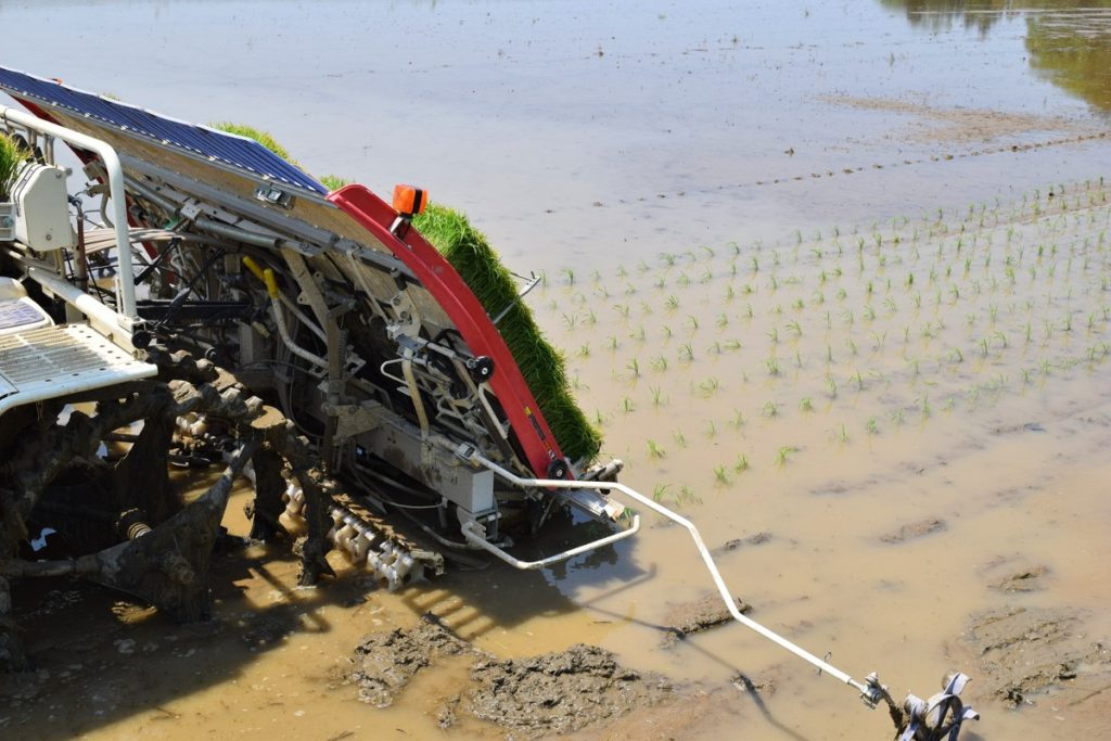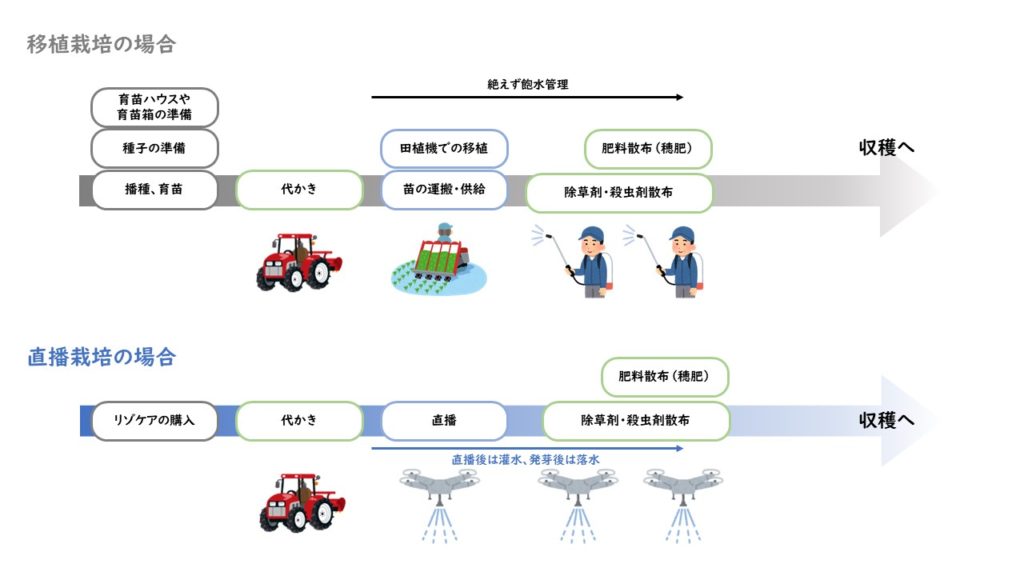 これは一般的な移植栽培のイメージで、ご覧の通り「田植え」作業が必要です。