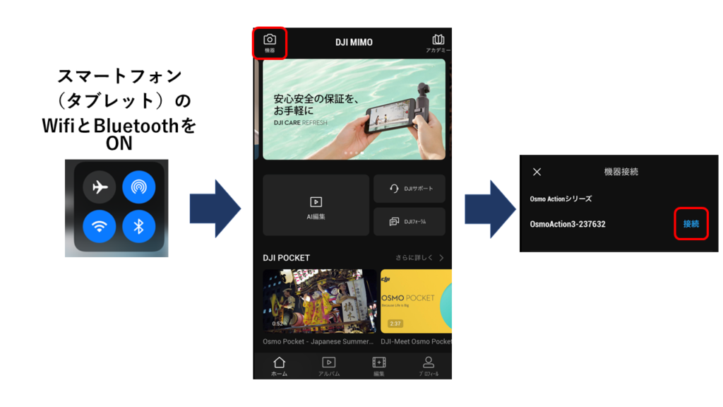 次に、Wi-FiとBluetoothをONにした状態のスマートフォンで、DJI Mimo を起動してください。左上カメラマークの[機器]をタップすると、周囲にあるDJIガジェットを探してくれます。同時に Osmo Action 3 の電源が入っていることも確認してください。Osmo Action 3 が検出されたら、[接続]をタップすると接続できます。