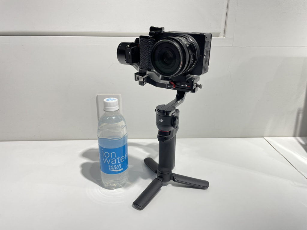 化粧箱を開けて、付属の三脚をセットするとこのような形になります。グリップの底面には1/4インチねじの穴がありますので、お手持ちの三脚や一脚に取り付けてお使いいただけます。サイズ感が分かりやすいように、バキバキにセットアップした RS 3 Pro と500mlペットボトルの間に置いてみました。