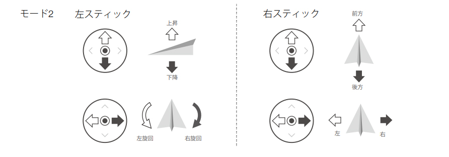 モード1は、左のスティックで機体の前後移動と旋回、右のスティックで上昇下降と左右の移動ができるようになっております。このモード1はラジコンヘリなどを操作方法と似ているため、ラジヘリ経験のある方にはおすすめの操作モードです。