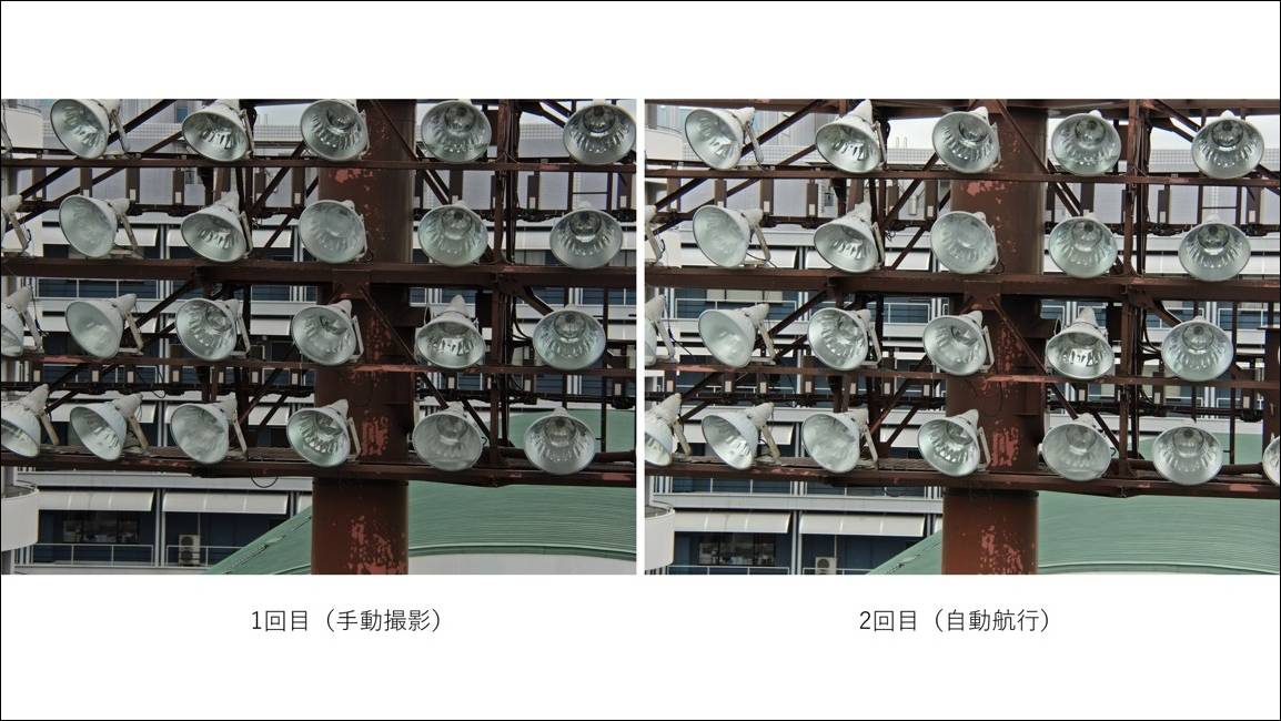 最後に、初回の手動操作による撮影と2回目以降の自動航行時の実際のデータ(写真)を見比べてみましょう。「100%同じ写真!」とまではいきませんが、狙った対象を撮り逃さないできあがりとなっています。