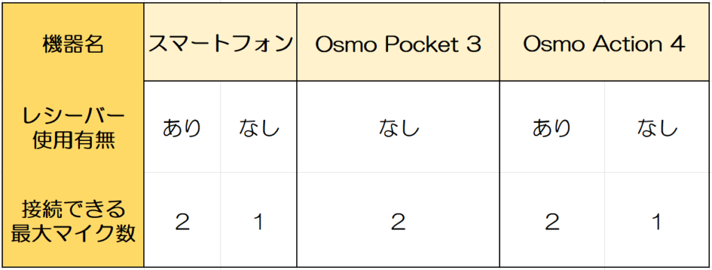 なおレシーバーを使用せずトランスミッターをBluetooth経由で直接スマートフォンに接続する場合は、デフォルトカメラアプリではなくDJI Mimoなどのアプリを使う必要があります。対応しているアプリについては以下となりますので、「スマホとBluetooth接続しているはずなのに、なぜかMic 2で収録できない!」とお悩みの方はこちらを参考にしてみてください。