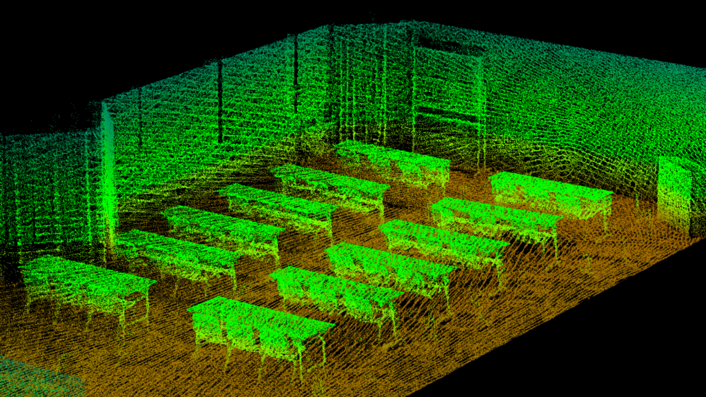 複数のSLAMの中でも最も高度な技術で、SF映画のような印象的な映像で周囲の環境を捉えるのが、3D LiDAR SLAMです。セキドで取り扱う3Dスキャナーを使用して、実際に建物の周りや室内をスキャンしたデータがこちらです。