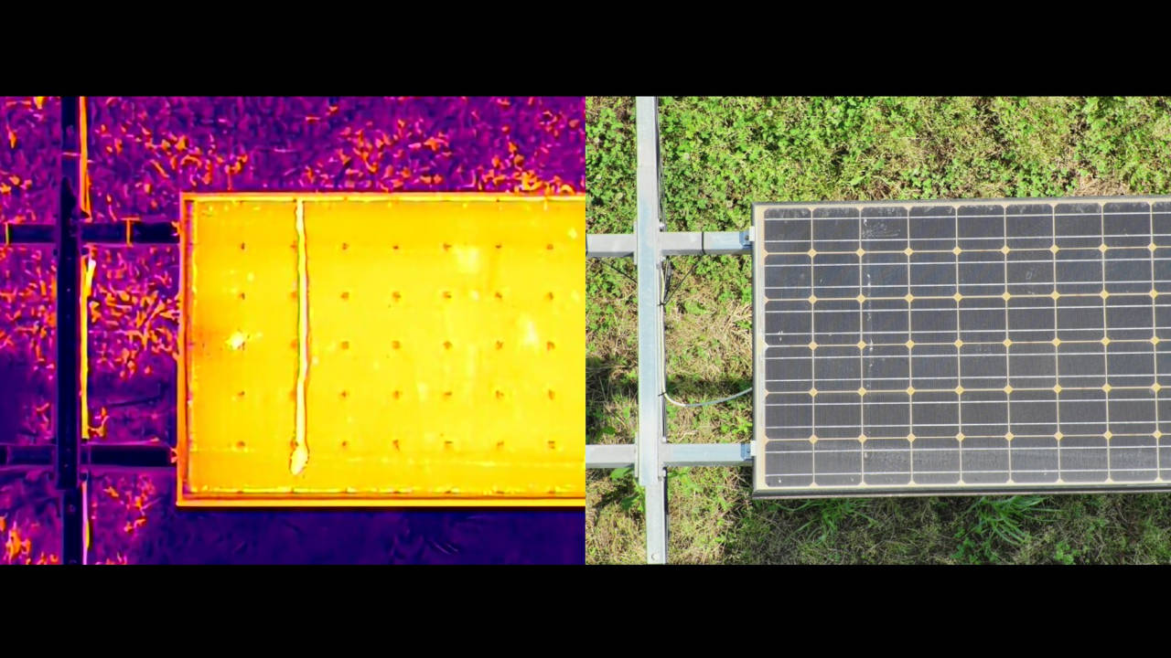 今回、H30Tを用いて発見したソーラーパネル上の鳥の糞による汚れがこちらです。標準機能で可視光と赤外線カメラの2画面比較が可能で、パネルの状態を簡単に確認できます。