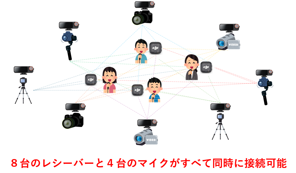これまでの Micシリーズでは、最大2名までのマイク接続とレシーバー1台のみの対応でした。しかし、今回の Mic 3 では、最大4名まで同時接続でき、さらにレシーバーは8台まで接続可能になりました。