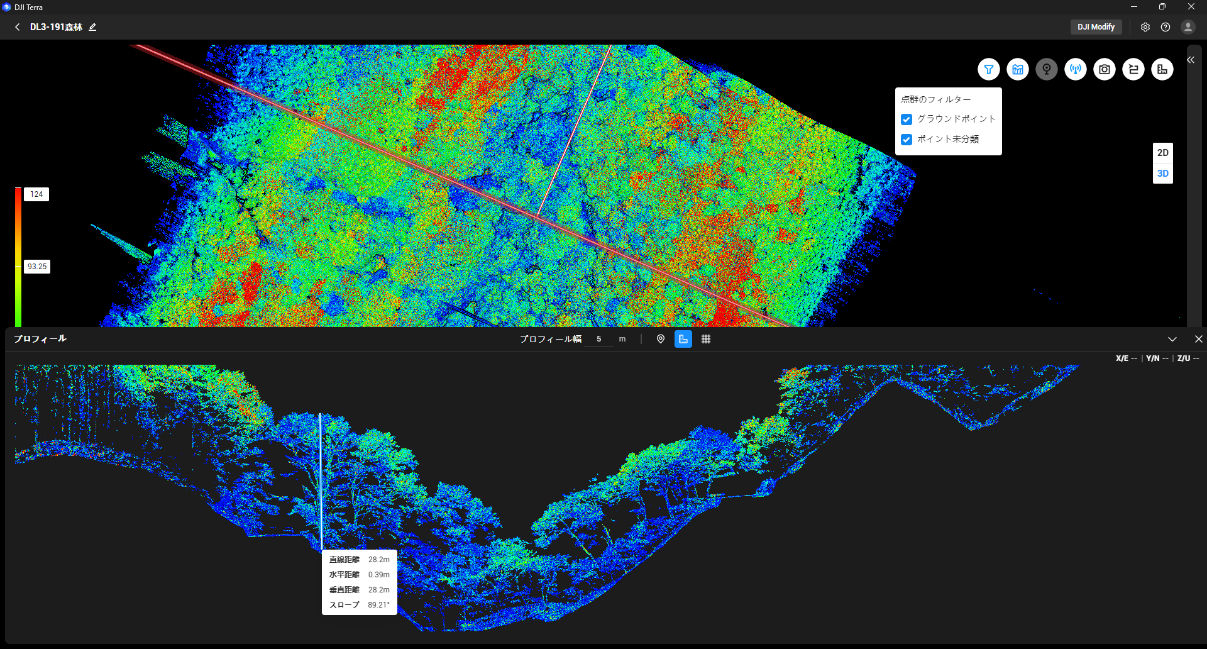 ・木々によって視認できない林道もグラウンドポイント分類することで確認可能